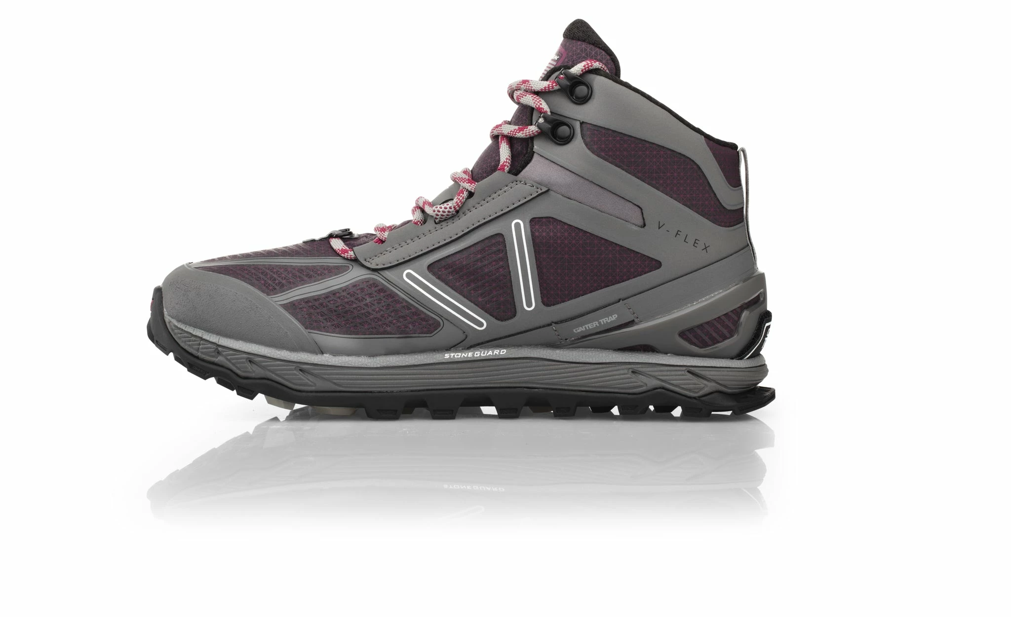 - Trailclaw –Â Canted lugs positioned strategically beneath the metatarsals to provide traction at toe-off.